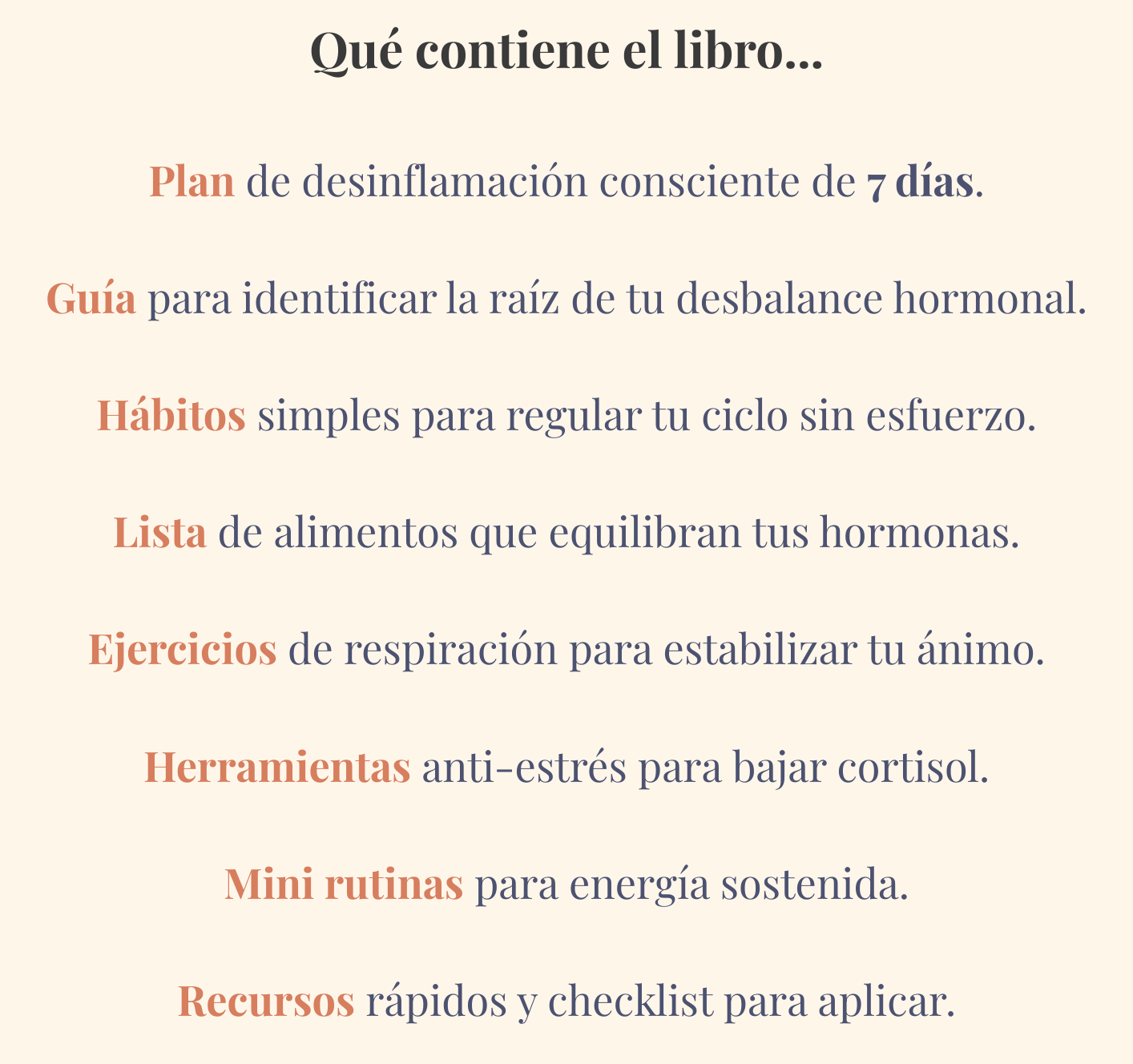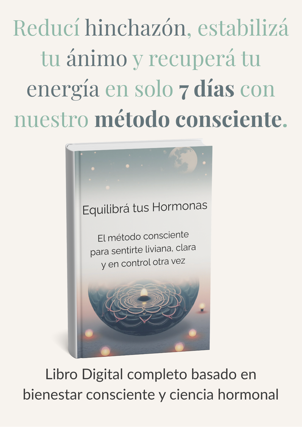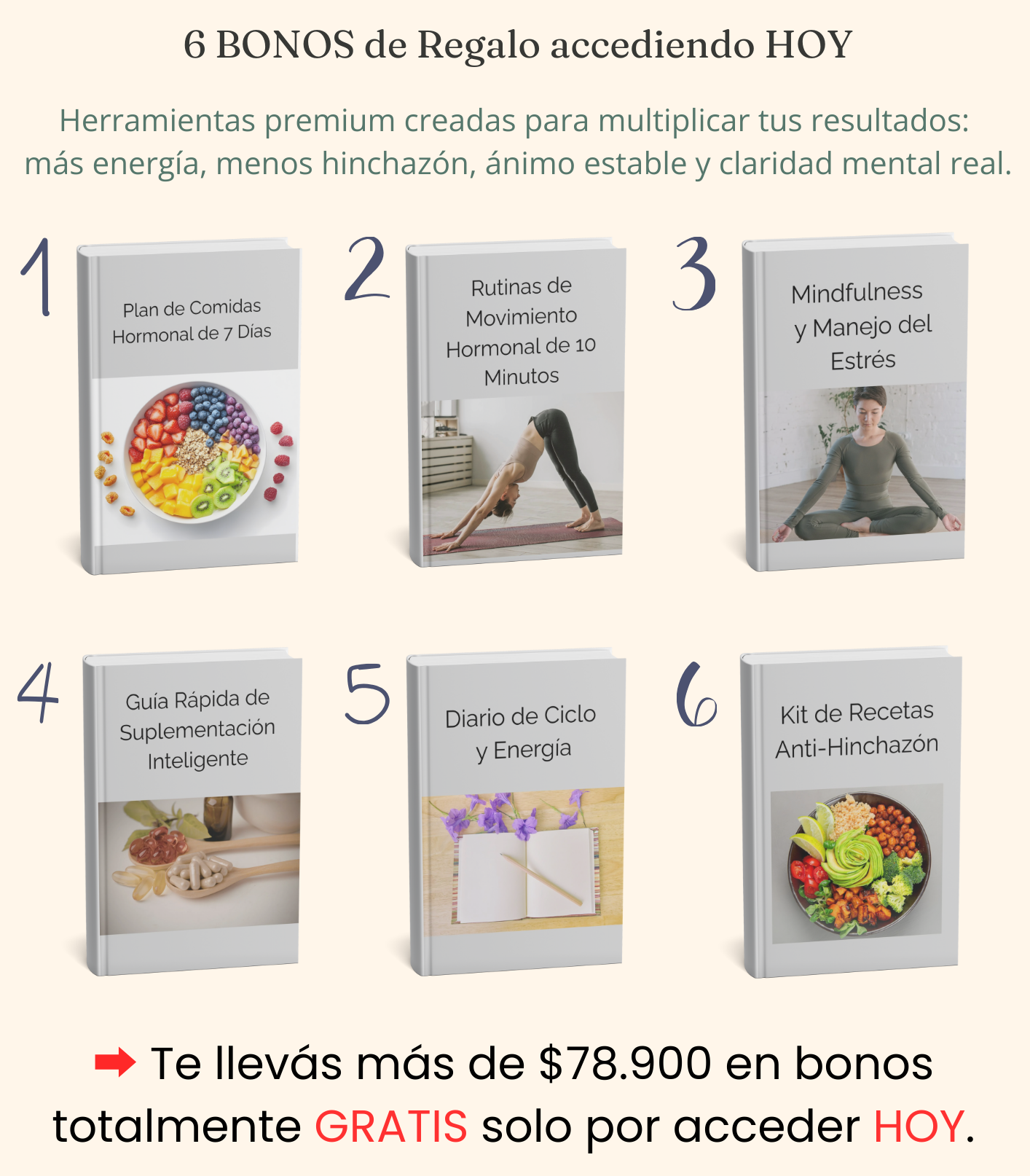 El ebook principal + 6 bonos exclusivos, con guías prácticas, tips, rutinas y recetas para equilibrar tus hormonas y sentirte liviana, clara y con energía.