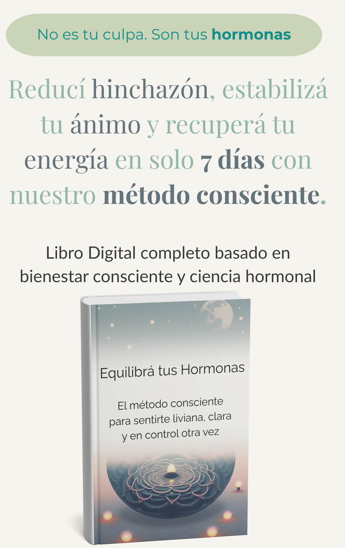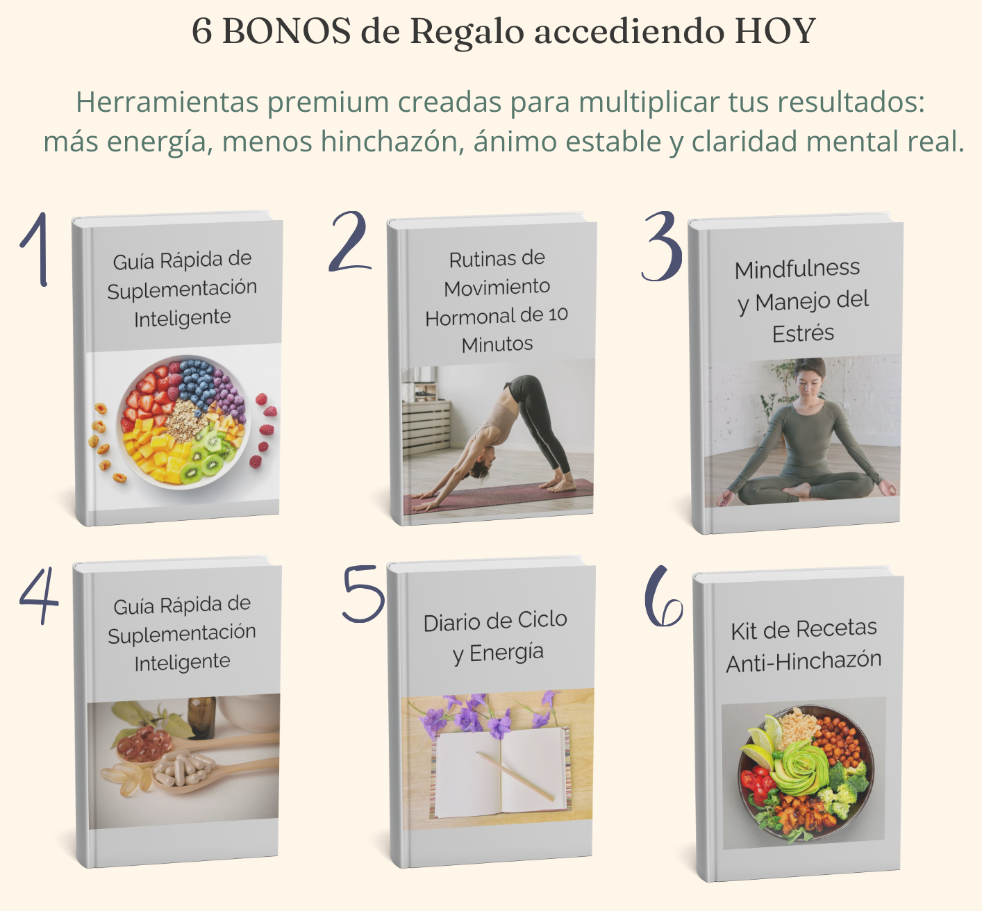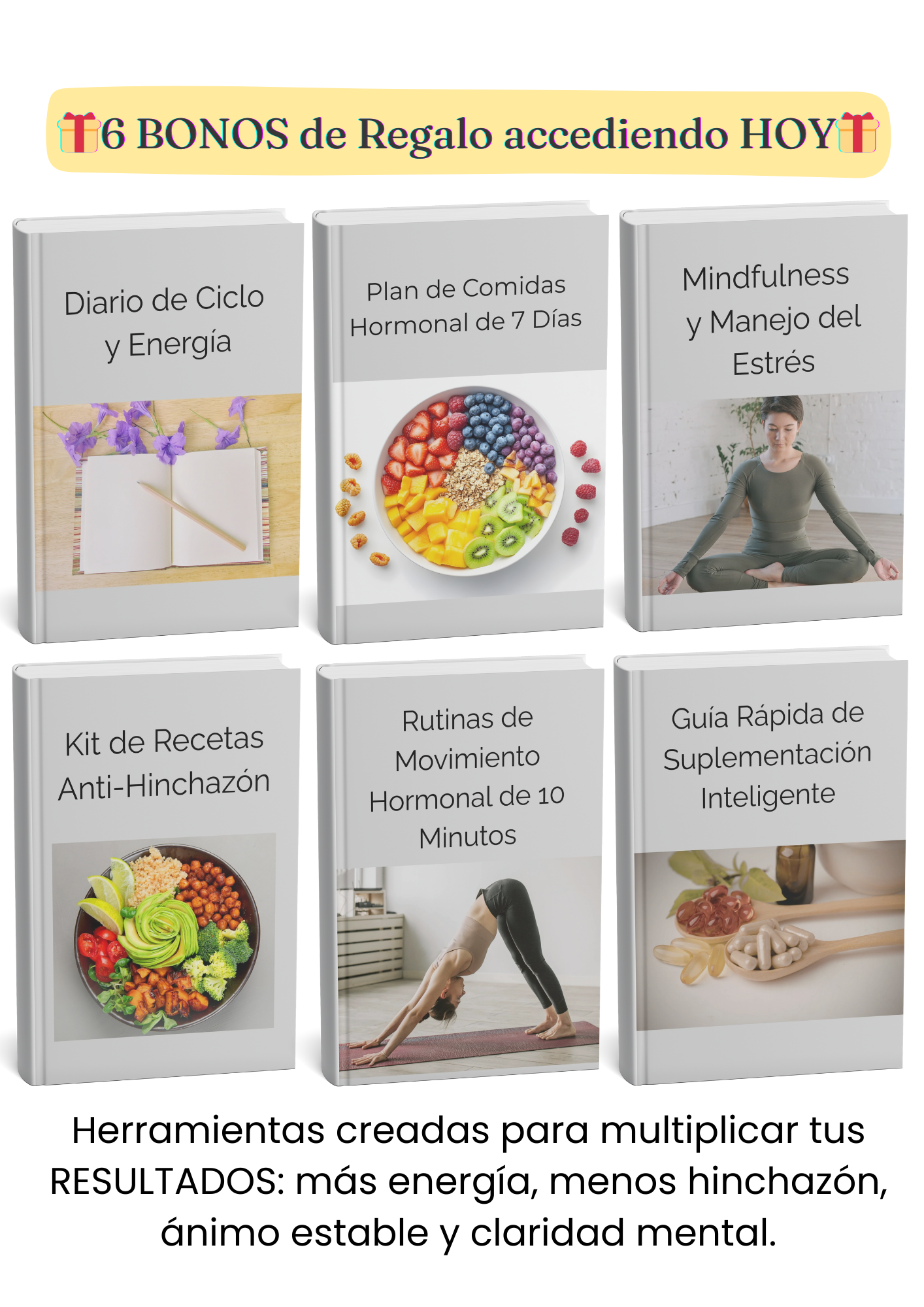 El ebook principal + 6 bonos exclusivos, con guías prácticas, tips, rutinas y recetas para equilibrar tus hormonas y sentirte liviana, clara y con energía.