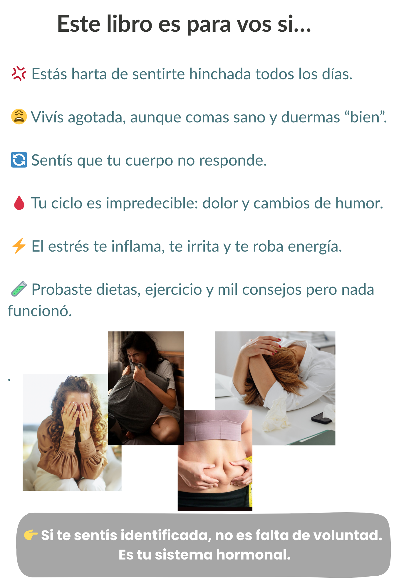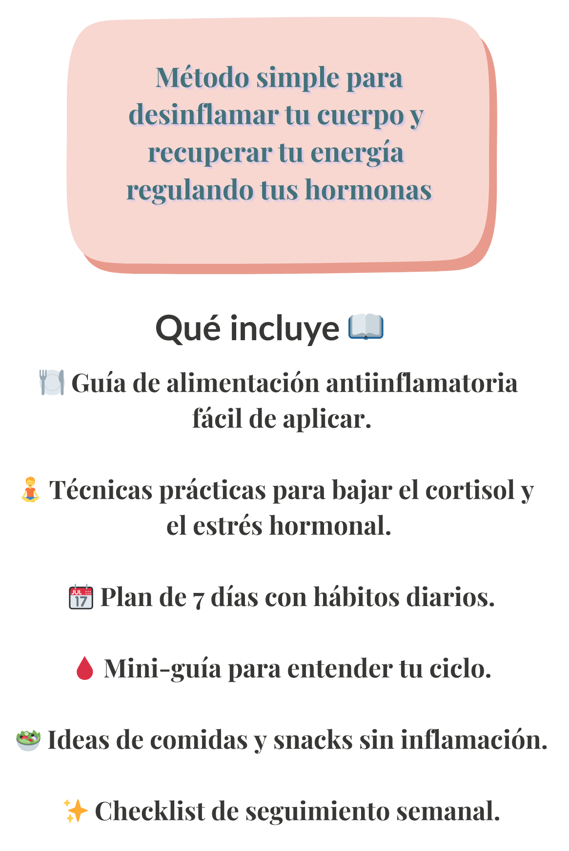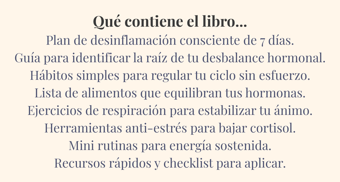 El ebook principal + 6 bonos exclusivos, con guías prácticas, tips, rutinas y recetas para equilibrar tus hormonas y sentirte liviana, clara y con energía.