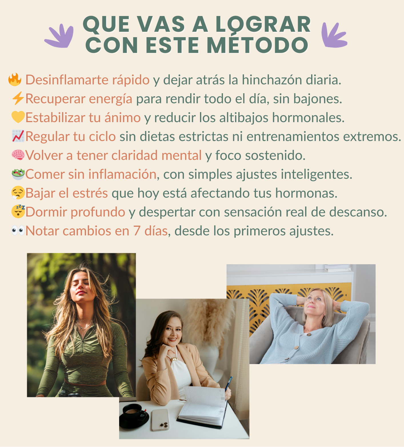 ⭐⭐⭐⭐⭐"A los pocos días noté menos retención y dormí mejor. Me encantó que no exige dietas estrictas ni cosas imposibles. Es realmente un método consciente."